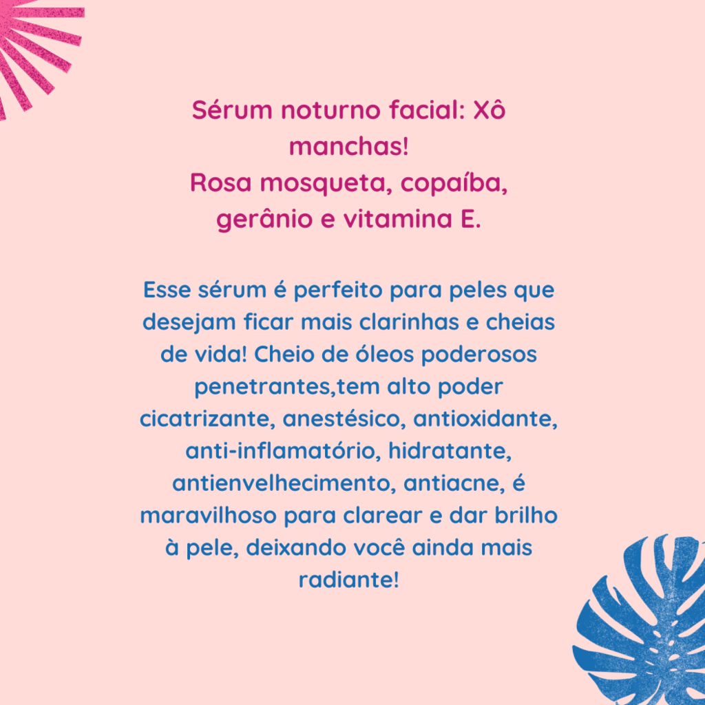 ATENÇÃO! A LINHA XÔ MANCHAS NÃO É INDICADA TER CONTATO COM O SOL! SE FOR AO SOL, É IMPORTANTE USAR PROTETOR SOLAR! # Indicamos o uso noturno para melhor aproveitamento.