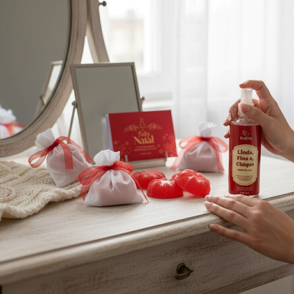 Vem com um Body Splash vegano de Baunilha com Avelã, 3 sabonetes artesanais, uma caixa de MDF linda e uma cartinha de Natal especial — tudo feito com amor para surpreender quem você ama.