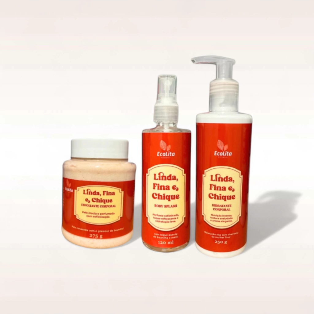 Linha: Linda, Fina e Chique! Contém 3 unidades: Body Splash + Hidratante + Esfoliante Body Splash | Linda, Fina e Chique! | Quente e Elegante! | Baunilha com Avelã | Vegano