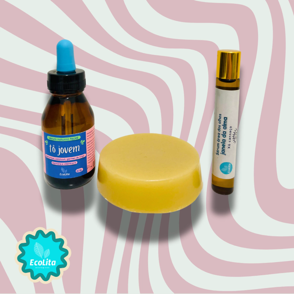 Esse kit contém: 1 Serum Janela da Alma, 1 Sérum Tô Jovem e um sabonete de argila dourada de brinde.