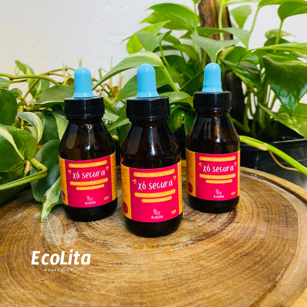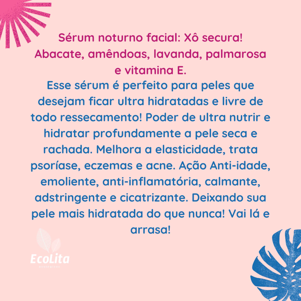 Sérum noturno facial: Xô secura! Abacate, amêndoas, lavanda, palmarosa e vitamina E.